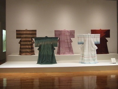 『源氏物語』をテーマにした作品群も前期、後期で総入れ替えになります。桐壺や若紫などに象徴される紫の色など、平安時代の貴族の色彩感覚が物語の人物像の描写に深く関わっているこの物語の各帖を、草木で染めた糸で織られた着物で表現した作品です。