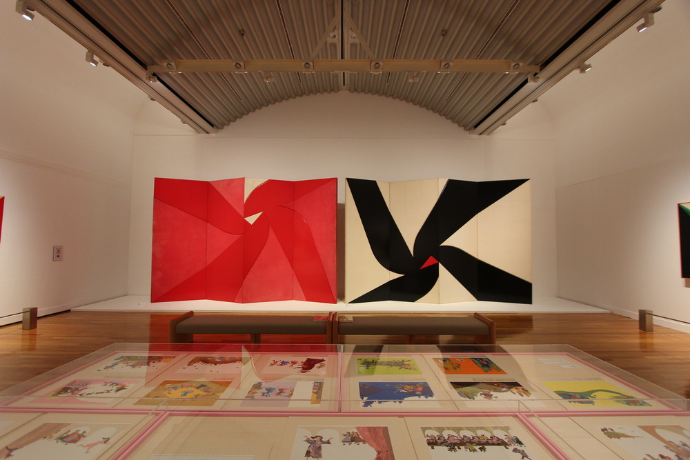 会場は、ご夫妻の歩みと創作の軌跡をなぞるかたちで構成しています。壁面には、高橋秀氏のダイナミックな作品が並び、手前の展示ケースには、藤田桜氏の布貼り絵による絵本の原画を多数展示しています。今回、お二人の希望で、小さなお子様にも絵本原画をより楽しんでいただけるようにと展示ケースの高さを低くおさえています。