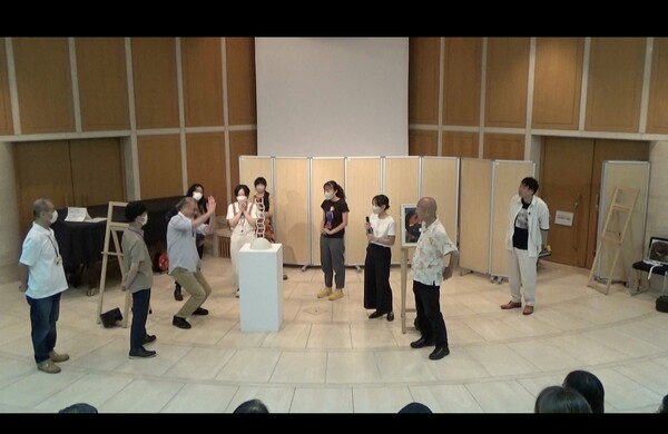 最終決戦では世田谷美術館の収蔵品から抽象作品が絵画、彫刻それぞれ1点ずつ登場し、決勝メンバーには1作品につき、掛け声を1度だけ披露してもらいます。運ばれてくる決勝の選出作品を捉えた決勝メンバー。会場にこれまでにない緊張感が漂う中、選ばれし猛者たちが作品を静かに見つめ始めます。抽象作品にエールを送るという、最も難易度の高い熾烈な戦いの火ぶたが静かに切って落とされました。