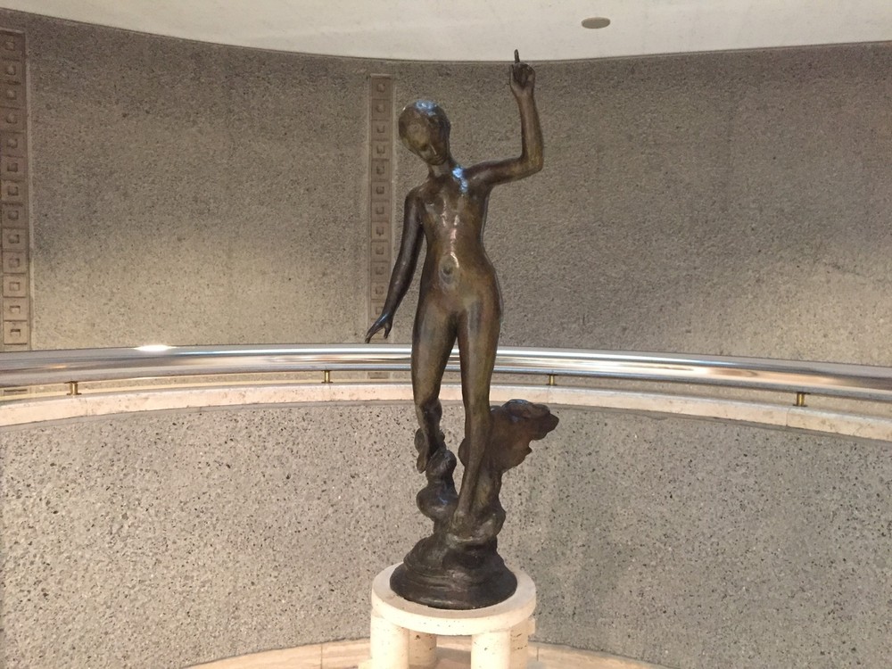 アントワーヌ・ブールデルの《オーロラ》、この作品は美術館エントランスを入ってすぐ左、企画展示室入り口辺りに展示されています。この作品も美術鑑賞教室ではとても人気があり、展示室に入る前、美術館での最初の作品として鑑賞するグループが多く見られます。そして、必ずと言って良いほど、子どもたちはポーズを真似ます。
