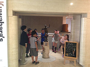 その他にも、「泳いでいる最中に水着が脱げて足に絡み付いてしまったけど1位になった人の表彰台でのポーズ」や「火事の中、煙にまかれながら家族を逃がそうと奮闘するお母さん」、「この世に未練を残しながら天国に召される人」、「迷った末に社長に給料をあげてとお願いする人」など、子どもたちの演技に大笑いしつつ、なるほど、と感心するものばかり。子どもたちは彫刻の隅々までよく見つめ、情報を引き出し、繋げ、短時間でちゃんとオチのあるお話を作り、役を決めて、練習し、机やイスを工夫して舞台を作り、見事に演じました。授業といいつつ、こちらがひたすら楽しませてもらった1日でした。
