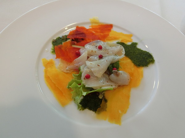 続くオードブルは、柔らかな生蛸のマリネ。藤田桜氏の布貼り絵の作風をヒントにして、布に見立てたカボチャやパブリカなど、色鮮やかな野菜のペーストのシートで巻いて召し上がっていただく一品です。