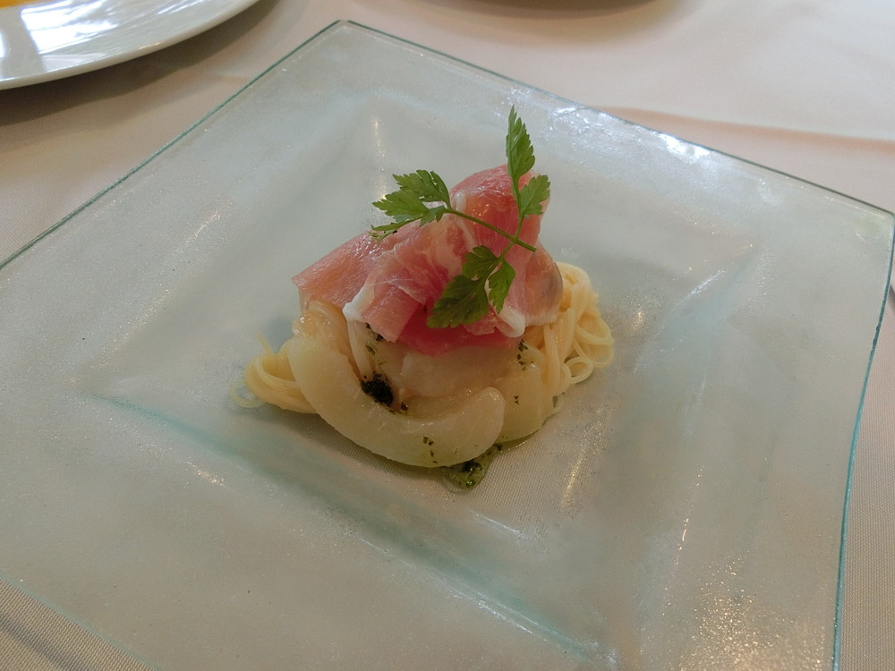 柔らかい白桃の甘酸っぱさと生ハムの塩味が絶妙なバランスで、口いっぱいに桃の香りが広がります。バジルの風味も爽やかさに一役買っています。