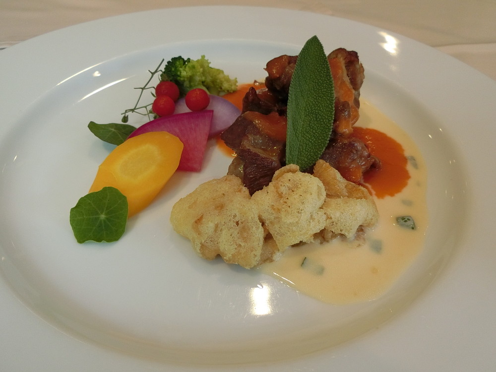 そしてメーンの肉料理は、イタリア料理のカチャトーラという仔羊料理をアレンジしたもの。二人が41年間過ごしたローマにちなみ、白ワイン煮のローマ風に仕立てました。柔らかな仔羊を、肉の旨味たっぷりのソースと、きりっとした酸味のきいた白ワインソースの異なる2種のソースで楽しめます。