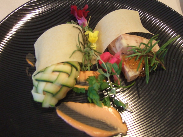 こちらは、アール・ヌーヴォーの曲線をイメージして、パスタの一種パートフィローの薄皮を、シャリ感のあるズッキーニのスライスを編み込んで覆ったサーモンのクネル(すり身を蒸して卵型に成型したもの)と鶏のテリーヌに添えています。