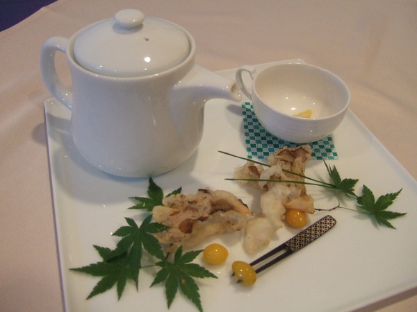 シンプルなポットからカップに注いでいただく《ほんのり甘い栗のcreamスープキノコのフリット添え》は、まさに秋の味覚をご堪能いただける一品です。栗の甘味と渋皮の苦みで、まるでチョコレートのように感じるクリーミーなコクのあるスープは、脇に添えられたサクサクして、少し塩味がきいたキノコのフリットとの相性も抜群です。チェコの人たちは、大のキノコ好きで、秋になるとキノコ狩りをする人も多いとのこと。チェコ人も、このスープは、本当に美味しいと感動されていました。