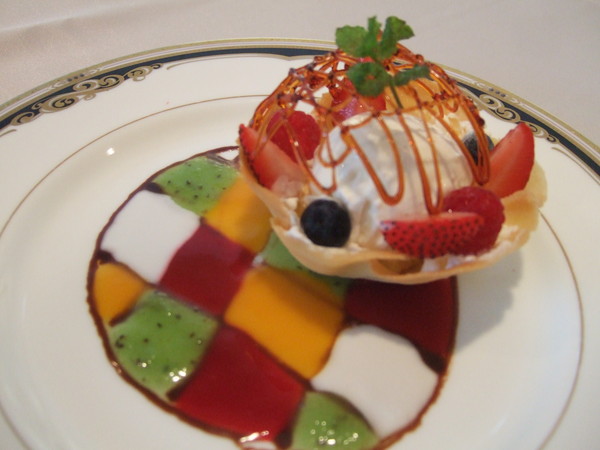 最後は、キウィやマンゴ―、ラズベリーなどのカラフルで目にも楽しいソースや、チョコレート、キャラメーゼの苦みがアクセントの飴細工とともに、アイスクリームを様々にお楽しみいただける、大満足の一品です。チェコの複雑なデザインの変遷を最後にまとめたかのようなデザートです。