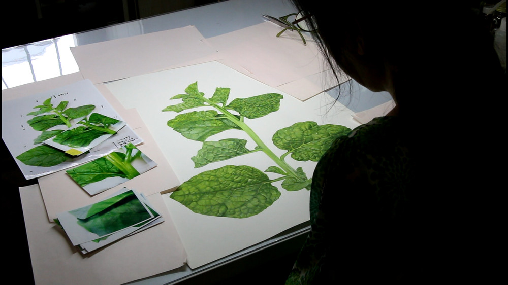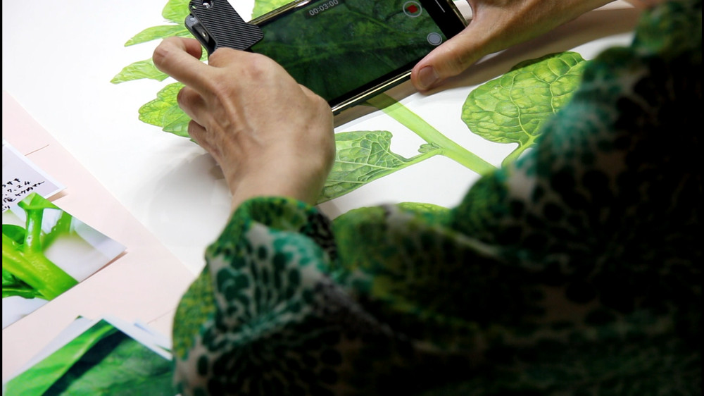 今回は直接、群馬さんのアトリエをお訪ねし、完成に近づきつつあるツルムラサキの作品を拝見させていただきました。ツルムラサキの作品は年末に出版予定の「野菜の本」に掲載予定で、作品の制作と共に載せる文章も現在執筆されているそうです。クローズアップによる撮影で、群馬さんの目に見えている葉っぱの世界をお楽しみください。聞き手はわたし、当館普及担当の東谷となります。