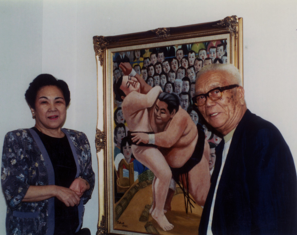 展覧会の会場にて、作者の花澤徳衛氏と旧蔵者の勝原恵美…
