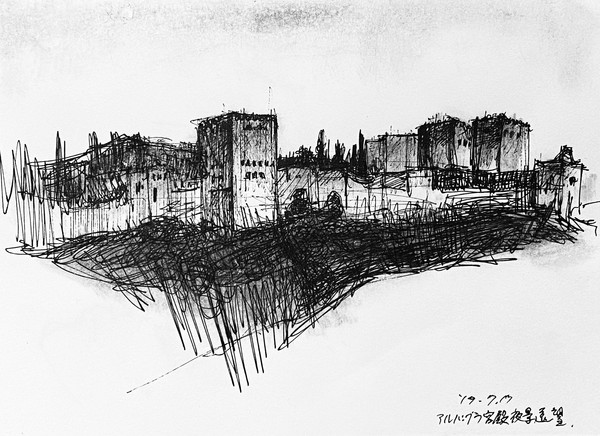 三宅一樹:旅先でのクロッキー《アルハンブラ宮殿夜景遠…