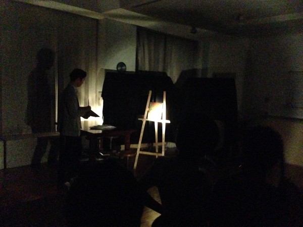 18:40 展覧会紹介ビデオの怪まずは、開催中の『金山康喜のパリ』展の紹介ビデオを見ます。展覧会の担当学芸員が金山の作品と人生を語ります。「33歳という若さで死んでしまった金山さんはどんなに無念だったでしょう。きっと、もっともっと絵が描きたかったに違いありません・・・」。すると途中で突然、画面が乱れ、薄暗い部屋に人影らしきものが映ります。「・・・ぼくはもっともっと絵を描きたかった。子どもの頃からやりたいことをちゃんと考えておけば良かった」と独白するこの人物は金山の亡霊でしょうか? 彼は、紙を破っては名札のようなものに詰め込んでいます。いったい何をしているのでしょう?