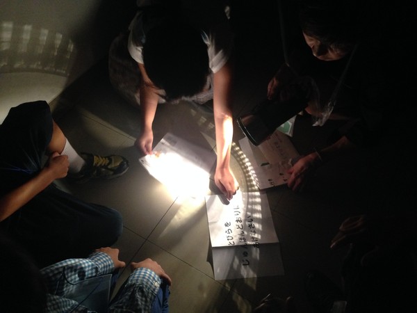 18:30 ナイトツアースタート!参加者は事前に募集した小学4~6年生45名。閉館後、受付で名札をもらって講堂へ。同じ色の名札の4,5人で1グループとなります。
