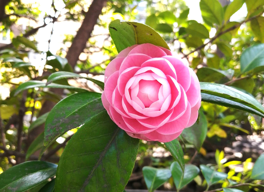 ピンクの八重の椿がきれいに咲きました