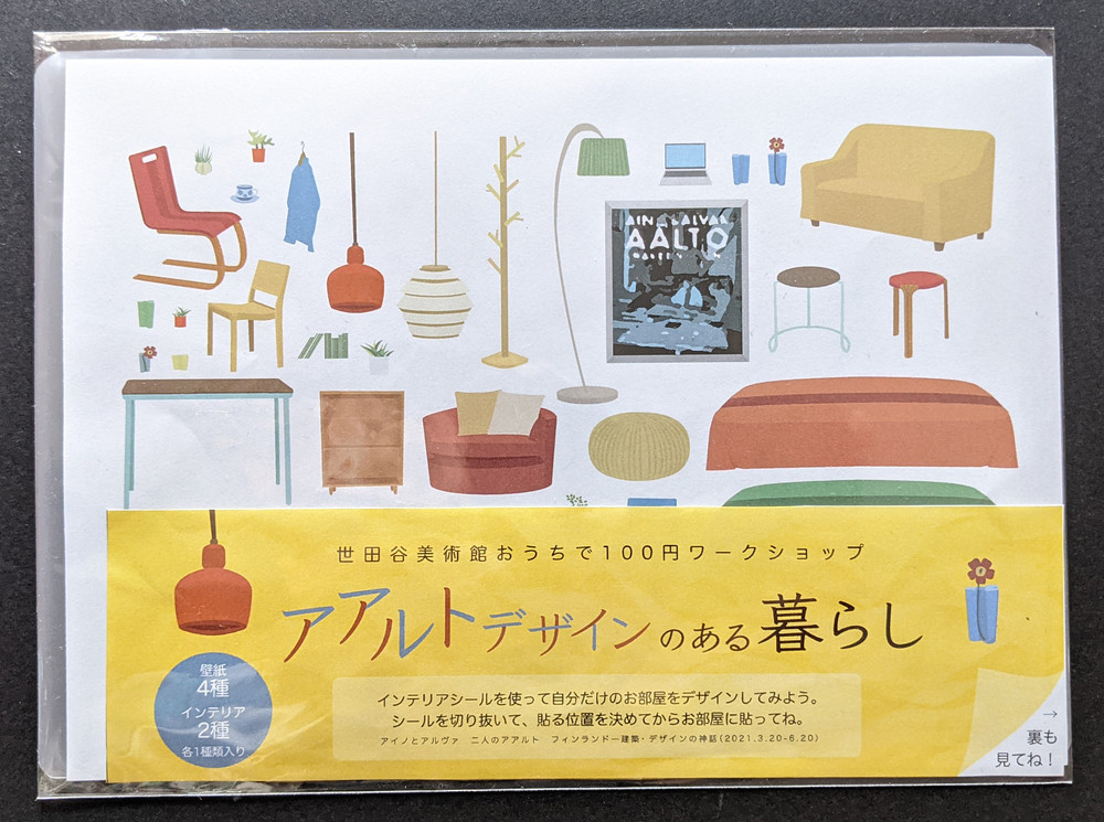 今回の100円ワークショップでは、展覧会「アイノとアルヴァ 二人のアアルト フィンランド―建築・デザインの神話」(2021年3月20日―6月20日)にちなんで、アアルトデザインのアイテムを含んだ家具とお部屋のシールセットを用意しました。