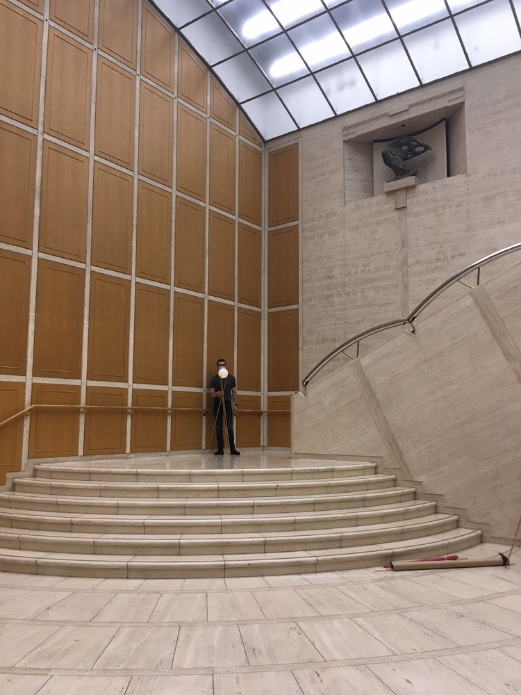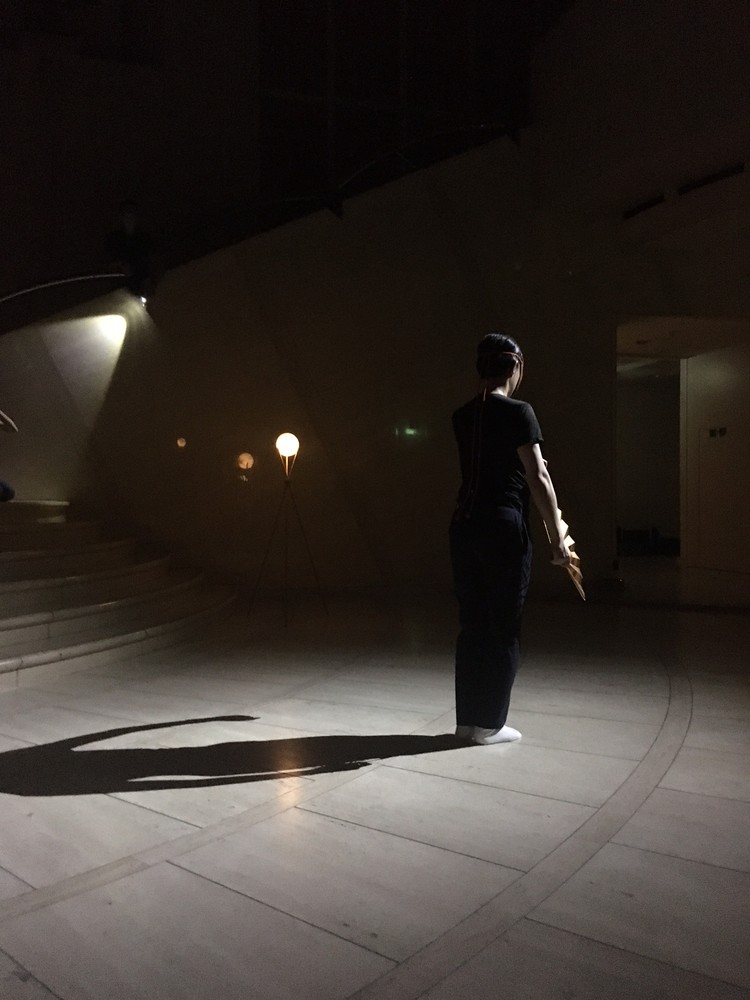 さて、能楽堂とは全く異なる空間である当館のエントランス。ここでわざわざ能楽師に舞っていただく、という挑戦にまつわる困難さは、数え上げたらキリがありません。