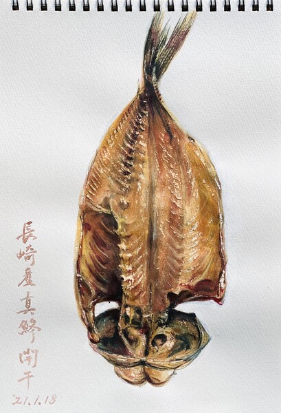 三宅一樹:着彩クロッキー《真鯵開干》 アクリル