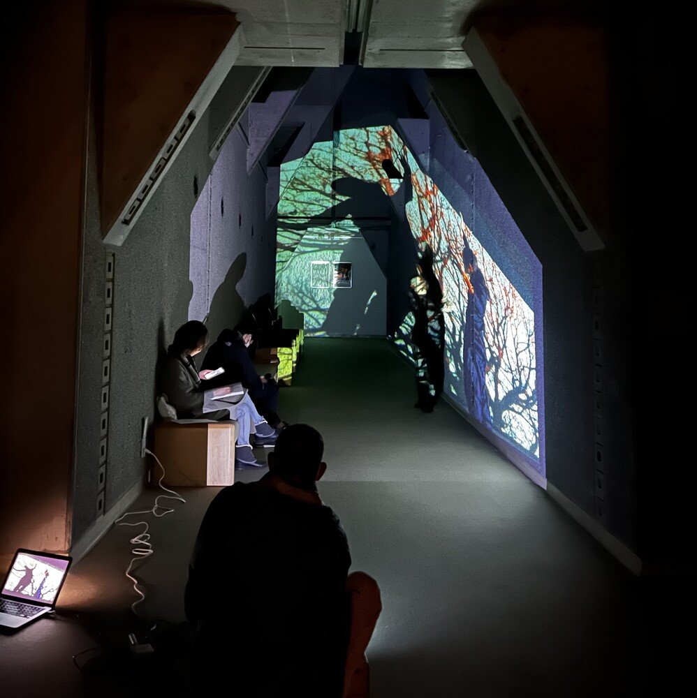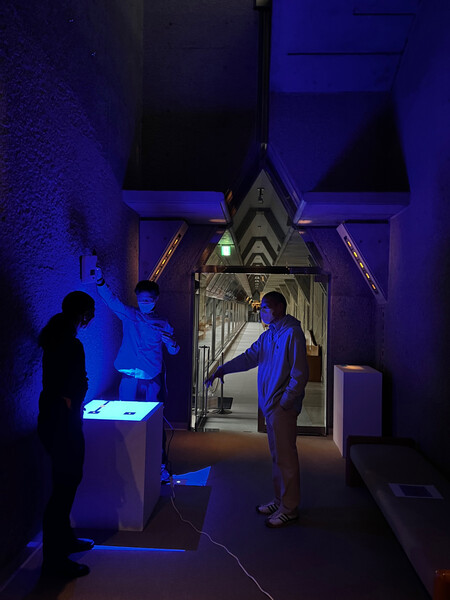 たくさんの可能性をひとつひとつ試してみて、「プロジェクション」、つまり夜の実験は、ほぼ実験をしているとおりの方法で、やや斜めから大きく壁面に投影することに。そして「散策」はその先、クヌギの木まであと少しという場所で、こぢんまりと見せることになりました。