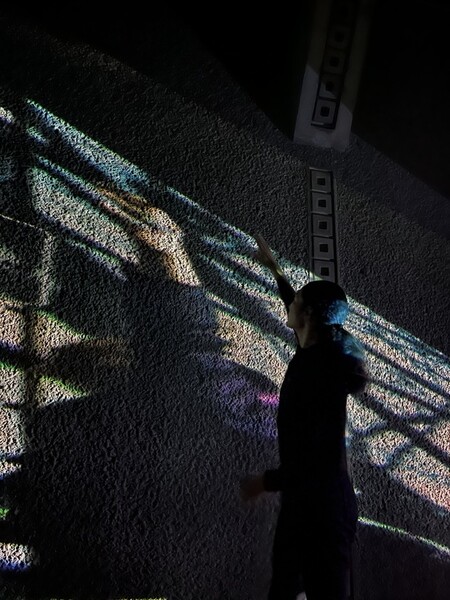 夜。真っ暗な廊下で実験の時間です。前回、クヌギの写真を壁に投影し、その前で踊る中村さんの姿を、今井さんが撮りました。その写真を壁面に投影しながら、中村さんがまた踊る。冬至のクヌギと年明けの中村さんとその影、そして今日の中村さんとその影が、闇の中で混在しています。その様子をまたまた今井さんが撮る。