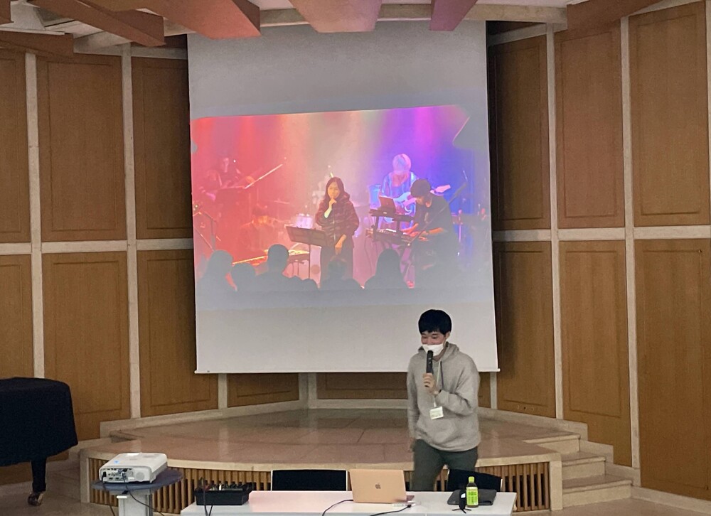 ボランティア勉強会で活動紹介をする額田大志。(202…
