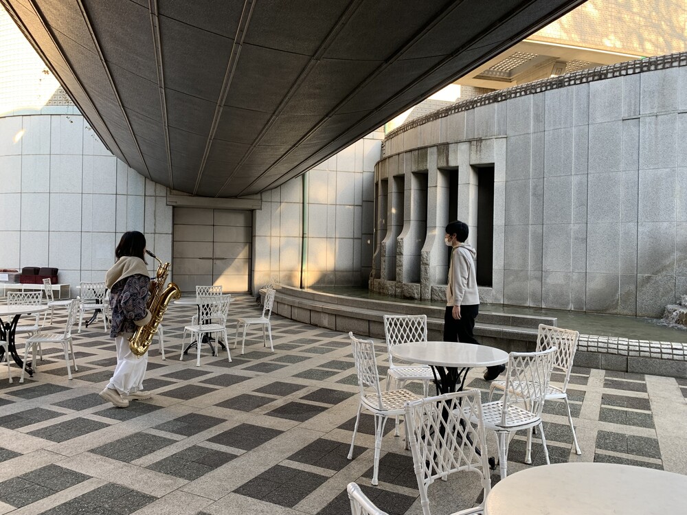 地下屋外のカフェテラスにて。関根伸夫《水彫れの滝》の…
