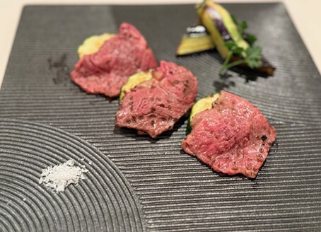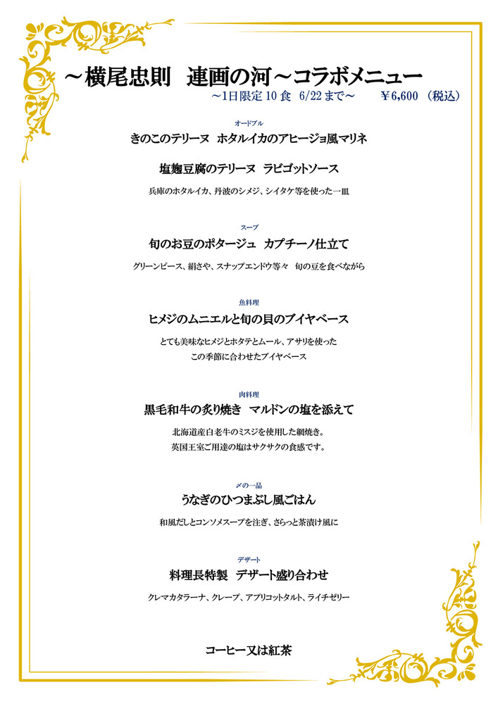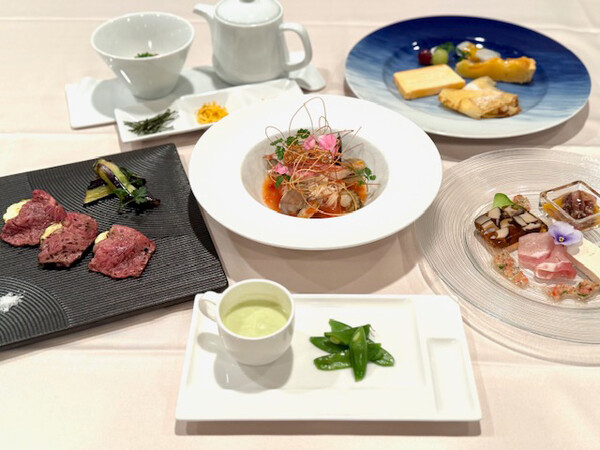 横尾忠則氏の出身地である兵庫県にちなんだ食材と、初夏の季節感を盛りこみました。メインの肉料理では旨味豊かな黒毛和牛を炙り焼きしました。(北海道産)。