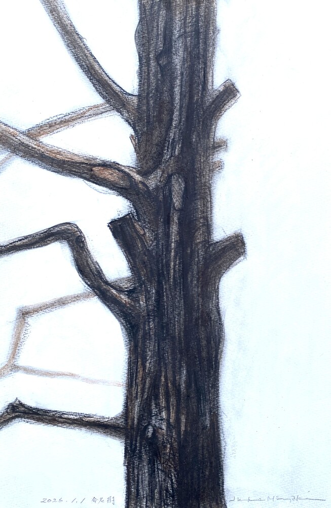 毎年お正月に、自分の名前の由来となったある一本の樹を描いています。今年もスケッチブックを携えて向かったところ、「樹木伐採のお知らせ」という衝撃の告知看板が…。区民のもしもの時の安全を守るために大切な対策のひとつと理解していますが、たった一人、この樹に特別な想いを抱いている人間がいることを、区の公園管理課に伝えました。