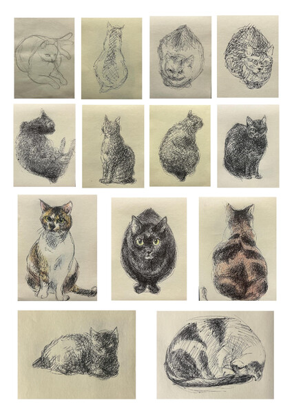愛猫を見つめる眼差しが純粋に表現された素晴らしいクロッキーの数々。モデルとなった猫達も、飼い主の愛情を感じ信頼しているからこそ、リラックスしてポーズをとってくれるのでしょう。眼と手が連動した一本一本のタッチに、クロッキーの本質が現れているようです。