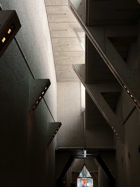 Photo caption: The corridor on the first floor of the Setagaya Art Museum. At the end of the corridor, you can see the giant sawtooth oak through the window.