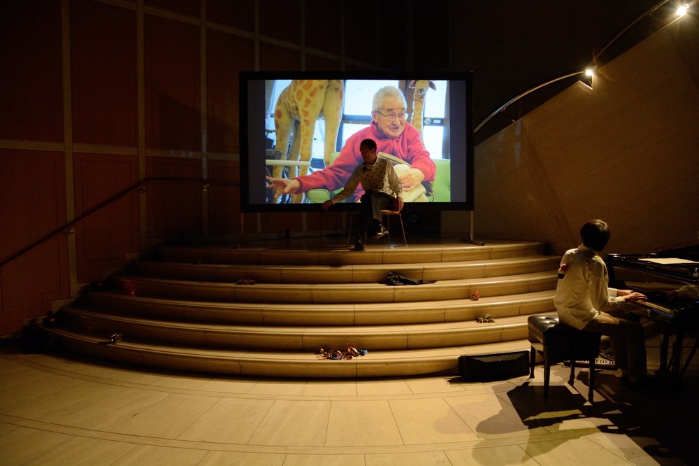 どうやって生きていけばいいのか?震災や原発事故のショックで、出口を見出せず暗中模索する中、お年寄りの知恵を借りようと思った。戦後の復興について懐かしそうに話す老人達のゆったりした声、微かな動きに、ぼくは勇気をもらった。些細な仕草、ちょっとした抑揚の中に、形容し難い安心感や力強さがあった。そうした味わいを映像・写真で預かり、そこから詩、旋律、舞踊が生まれた。日々の生活で忘れてしまいそうなお年寄りの微かな身体の声をエントランス空間に響かせる。映像とダンスと写真が空間と呼応する瞬間を噛みしめ、ピアノを弾こうと思う。(野村誠)