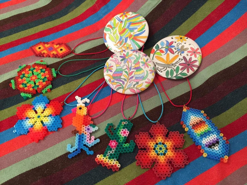 100円ワークショップ <メキシコのおみやげ> ●ウィチョル族のビーズ細工風ストラップ ●オトミ族のテナンゴ刺繍風カンバッチ