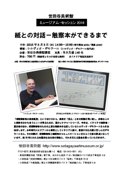 「視覚障害者の美術鑑賞」という切り口から、美術を「見る」ときの常識を問い直し、多様な人々と美術を分かち合うヒントを得るための、夏のレクチャーシリーズ。今年は、イタリアで美術書・歴史書のほか、視覚障害者のための上質な触察本を出版しているシルヴィオ・ザモラーニさんをお招きします。少年時代にエジプトから移民としてイタリアに渡り、言葉や文化の壁に苦しんだザモラーニさん。その体験が、視覚障害者と晴眼者のコミュニケーションをひらく仕事の原点になっています。約20年にわたる先駆的なお仕事の詳細と、それを支える信念を語っていただきます。