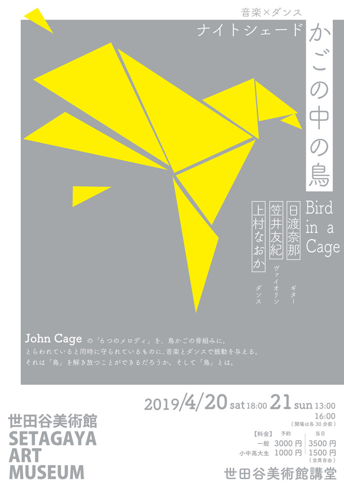 ジョン・ケージの曲を主なモチーフに、「ケージ=かご」のイメージをふくらませた今回の公演タイトルは、「かごの中の鳥」。