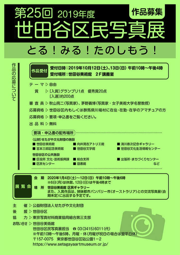 ■作品募集第25回世田谷区民写真展を、2020年1月4日(土)~1月12日(日)の会期で開催いたします。これにともない、作品の募集受付を2019年10月12日(土)と13日(日)に行います。詳細は要項・申込書をご確認ください。