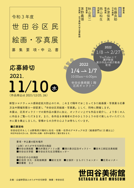 ■作品募集新型コロナウイルス感染症拡大のために、これまで隔年で行ってきた絵画展、写真展を応募方法や開催形態を一部変更し、「世田谷区民絵画・写真展」として同時に開催します。