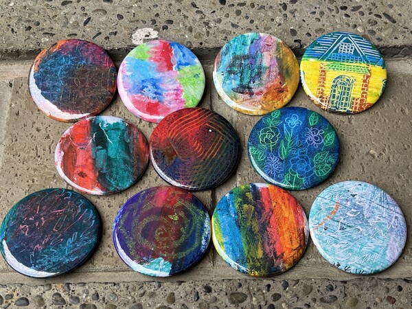 麻生三郎展の期間中はオイルパステルを使った油絵風のカンバッチ作りをおこなっています。
