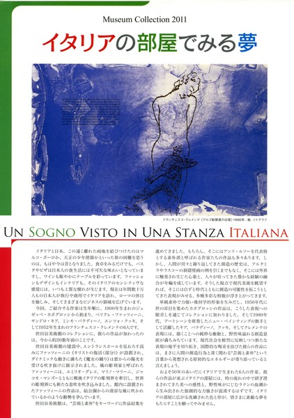 力強い幾何学的な形象を生みだしたカポグロッシ、風の彫刻家と謳われたファッツィーニ、そして、1980年代のアートシーンを席巻したニューペインティングの旗手キア、パラディーノ、クッキ、クレメンテ。イタリアの6人の作家をご紹介します。洗練された色彩とフォルム、そして野性味がにじむ独創的な表現をお楽しみください。