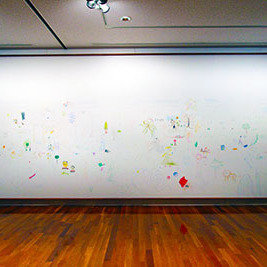 現在、当館では開館30周年を記念して、企画展「コレクションの5つの物語」を開催しています。この30年、美術館も作品も訪れる人によって、物語を積み重ねてきました。そんな思いを込めて、展示の最後に「つむいでいく物語」という参加コーナーを設けました。大きな額に縁取られた画面内に訪れた方にご自由にお描きいただき、ひとつの作品として、物語を積み重ねていっていただく趣向です。作品の状況は、このブログで随時ご紹介していきたいと思います。 1枚目は11月30日現在の状態です。2枚目は初日からいる「くらげそ」。3枚目はクリスマスツリーと右端に先週から始まった絵しりとりです。ルソー→ソーダ→だんご→ゴミ→ミルク→くり→りんご→ゴーヤ→ヤヌス→スイカ→カステラ→ラー油→湯→ユズ→ずんどう(日々更新中)と思われます。
