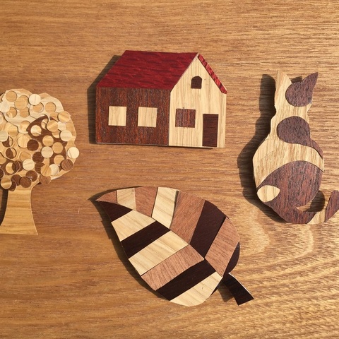 薄い天然木材を組み合わせた寄木のマグネットづくり。