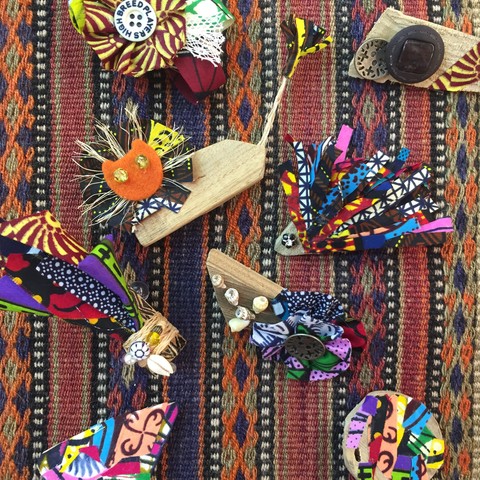 展覧会毎に、様々な趣向を凝らした内容で、子どもから大人までその場で楽しめる簡単な工作などを行う100円ワークショップ。この度は、カラフルなアフリカの布やビーズ、ボタン、貝など、様々な材料を板にコラージュしてブローチまたはマグネットを作ります。