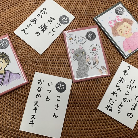 展覧会毎に、様々な趣向を凝らした内容で、子どもから大人までその場で楽しめる簡単な工作などを行います。この度は、短い文章で読み札を作り、描いた絵札はマグネットにします。読み札にメッセージを託してプレゼントに!