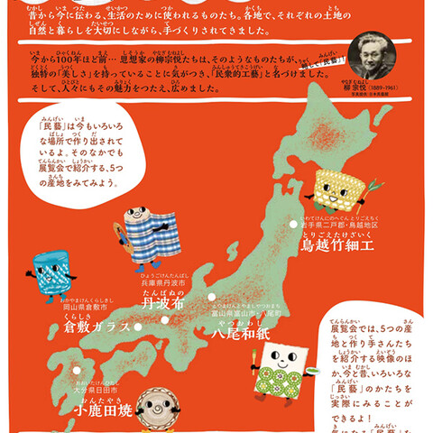 「民藝(みんげい)ガイド 5つの産地(さんち)から」「民藝(みんげい)」は今もいろいろな場所で作り出されています。大分県の小鹿田焼(おんたやき)、兵庫県の丹波布(たんばぬの)、岩手県の鳥越竹細工(とりごえたけざいく)、富山県の八尾和紙(やつおわし)、岡山県の倉敷(くらしき)ガラス。それぞれの作り方や現在の作り手のことば、産地で働く人々の“いま”を紹介します。※このガイドは、展覧会の第Ⅲ章-2「民藝の産地―作り手といま」で取り上げる5つの産地を紹介するものです。※世田谷区の小学4~6年生および中学生を対象に配布したガイドのPDF版がダウンロードできます。ぜひご利用ください。ダウンロードはこちら[PDF]