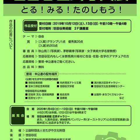 ■作品募集第25回世田谷区民写真展を、2020年1月4日(土)~1月12日(日)の会期で開催いたします。これにともない、作品の募集受付を2019年10月12日(土)と13日(日)に行います。詳細は要項・申込書をご確認ください。要項・申込書ダウンロード(PDF)[応募資格] 世田谷区もしくは群馬県川場村に在住・在勤・在学のアマチュアの方(年齢不問) ※区外在住の方には、受付時に在勤、在学の証明をご提示いただきます。[作品受付]●日時2019年10月12日(土)、13日(日) 午前10時~午後4時●場所世田谷美術館 2階 講義室 台風19号の影響でお越し頂けない方がいらっしゃる可能性を考慮し、10月14日(月・祝)も午前10時~午後4時、受付いたします。(場所:地下創作室C)[審査員]秋山 亮二(写真家)茅野 義博(写真家・女子美術大学名誉教授)[主催]公益財団法人せたがや文化財団 [後援]世田谷区[協力]東京写真材料商業協同組合第三支部[お問い合せ]世田谷美術館 世田谷区民写真展担当03-3415-6011(代) [展覧会]2020年1月4日(土)~1月12日(日)世田谷美術館 区民ギャラリー 「要項・申込書」の配布予定場所――(公財)せたがや文化財団の施設:世田谷美術館・世田谷美術館分館(向井潤吉アトリエ館・清川泰次記念ギャラリー・宮本三郎記念美術館)、世田谷文学館、世田谷文化生活情報センター、世田谷区の公共施設:区役所 文化・芸術振興課、総合支所、出張所・まちづくりセンター、 区民センター、図書館など※配布は8月上旬より