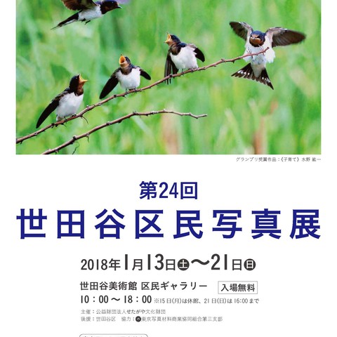 第24回 世田谷区民写真展を下記の日程にて開催いたします。ぜひご覧ください。第24回 世田谷区民写真展2018年1月13日(土)~21日(日)10:00~18:00※15日(月)は休館、21日(日)は16:00まで会場:当館区民ギャラリー入場無料審査員による写真教室(入賞作品講評)1月21日(日) 13:30~15:30(13:15開場)会場:当館講堂当日先着140名 無料ポスター(PDF)