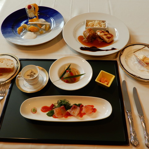 今回のコラボ・メニューは、髙山辰雄の出身地である大分から取り寄せた食材をふんだんにつかったコースです。和のテイストとフレンチの融合。新鮮な驚きにあふれた味わいが、寄り添い、響きあっています。砧公園の新緑につつまれながら、展覧会をご覧いただき、そして、滋味ゆたかな味のひと時をお過ごしください。メニューお造り焼き物先付デザートメニュー