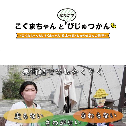 世田谷美術館公式YouTubeでは、美術館での鑑賞の仕方を学べる2つの動画を公開中です。1つは、現在開催中の展覧会「こぐまちゃんとしろくまちゃん 絵本作家・わかやまけんの世界」の会場からお届けする、安心してお子様とともに美術館を楽しんでいただくための動画です。【世田美チャンネル】こぐまちゃんとびじゅつかん(約6分)→世田美チャンネルをYoutubeで見るこの動画は、子どもと一緒に美術館に行って大丈夫?といったご心配や、親子での鑑賞が初めてという「美術館デビュー」をこれから迎える方に、安心して美術館を楽しんでいただけるように制作したものです。展示室の様子がご覧いただけるとともに、親子で学べる美術館での鑑賞の仕方のほか、ベビールーム(授乳室)、美術館のカフェなどもご紹介しています。もう1つは「おうちで100円ワークショップ」でおなじみの、ルソー人形くんと一緒に世田谷美術館をまわり、そこで出会う人たちから美術館でのお約束について学ぶ動画です。【セタビチャンネルJr.】美術館でのおやくそく(約17分)→【セタビチャンネルJr.】をYoutubeで見るこちらは、ぜひ小中学生のみなさんにご覧いただきたい動画です。美術館での鑑賞の際に、みなさんに守っていただきたい3つのお約束「走らない」「さわがない」「さわらない」があります。そのお約束を守ってほしい理由を、小中学生にもわかりやすくご紹介しています。夏休みに動画で美術館の鑑賞の仕方を学んで、美術館に遊びに来てください!